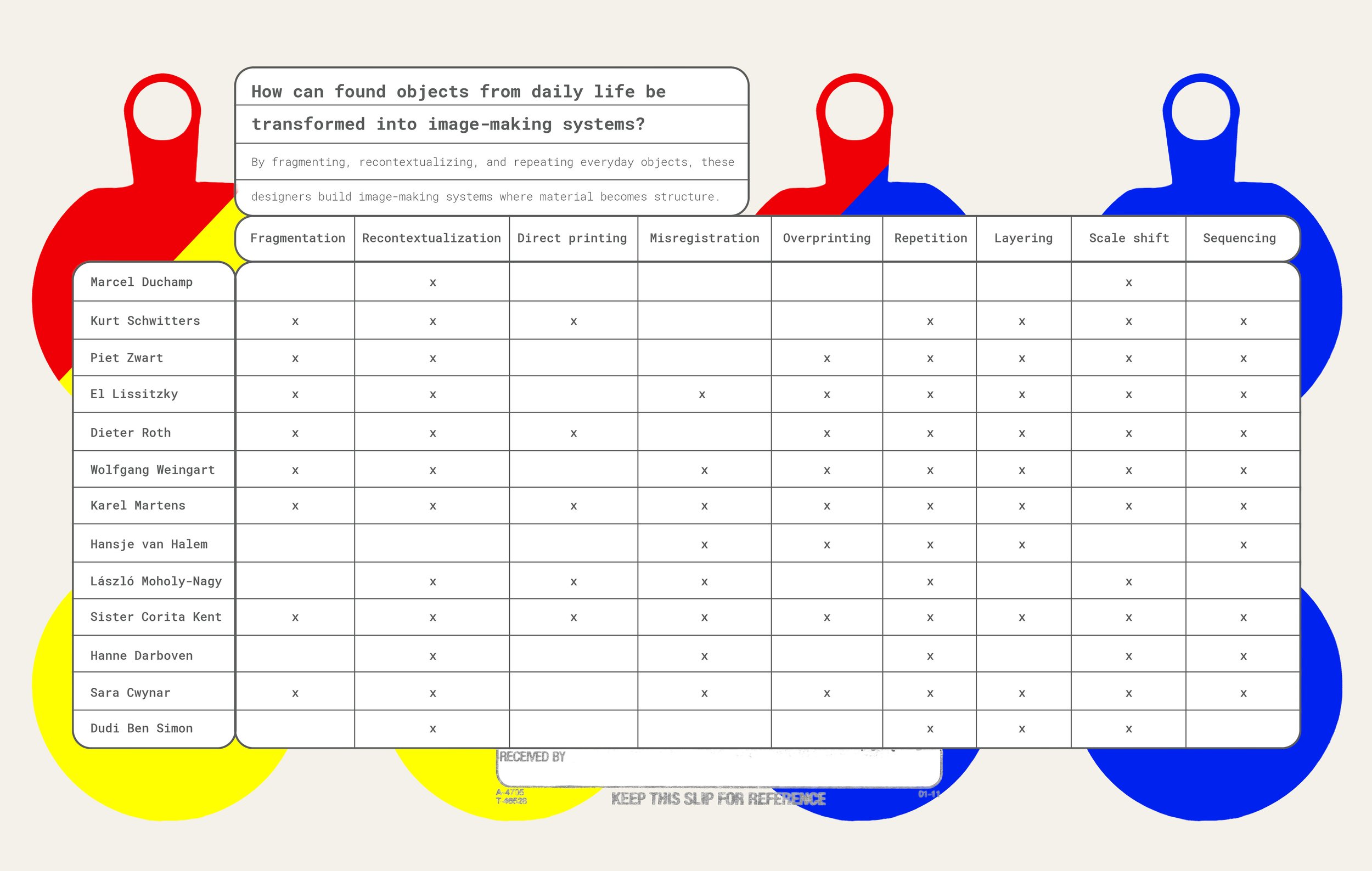 This project explores how everyday found objects can become tools for image-making. Inspired by Karel Martens, materials such as tickets, scraps, and small objects worked as patterns and graphics. Through repetition, overprinting, and imperfect registration, these objects transform from functional items into visual systems. The process embraces chance and accidents to shape the final image.